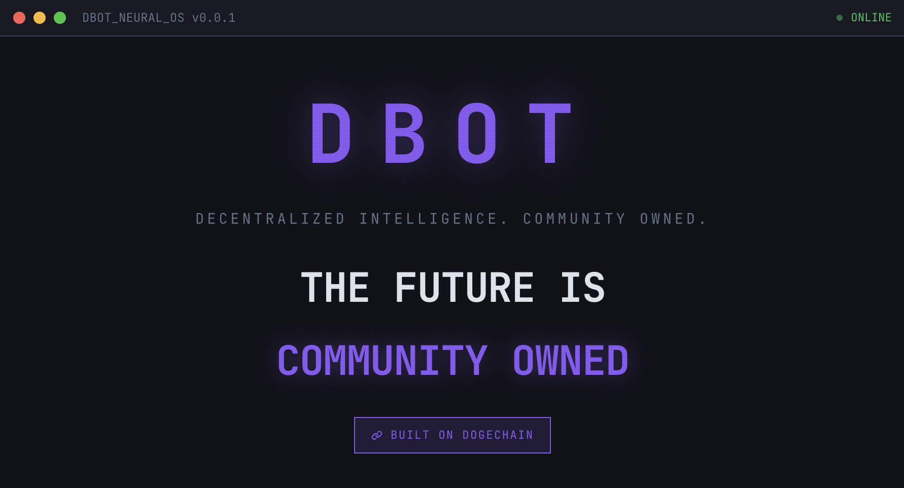 DBOT is the first community-owned AI agent built on Dogechain. Controlled by the DAO, shaped by the community.